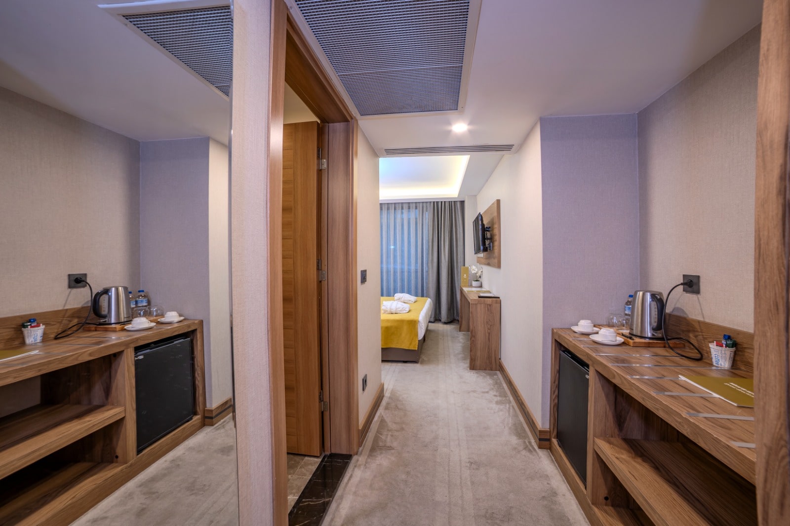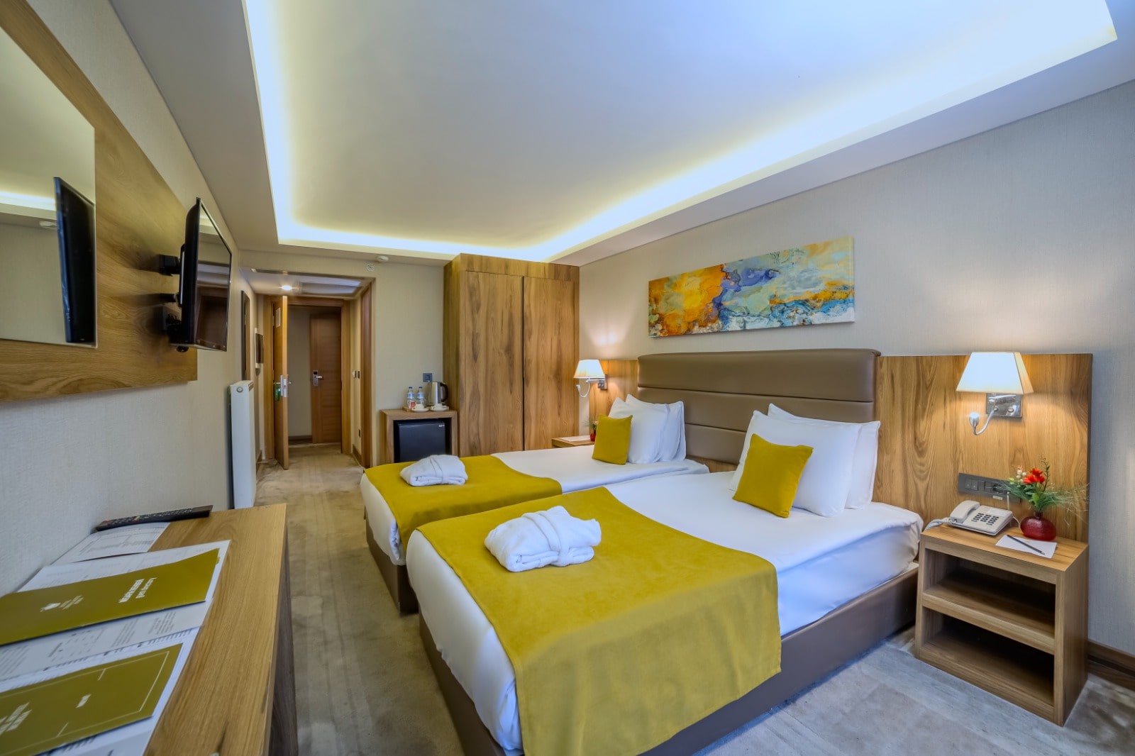 Our Deluxe Family rooms offer an unforgettable holiday experience with your family with its spacious and comfortable structure. Our rooms with a usage area of 40-45 m2 have a double bed and extra large areas where you can rest comfortably. Our rooms have free internet access, modern furniture and a large marble bathroom.