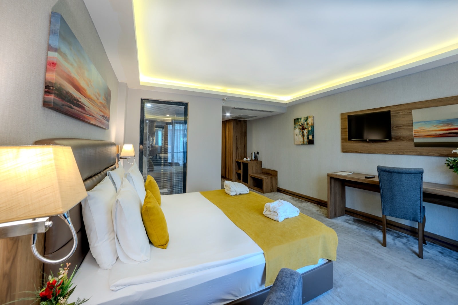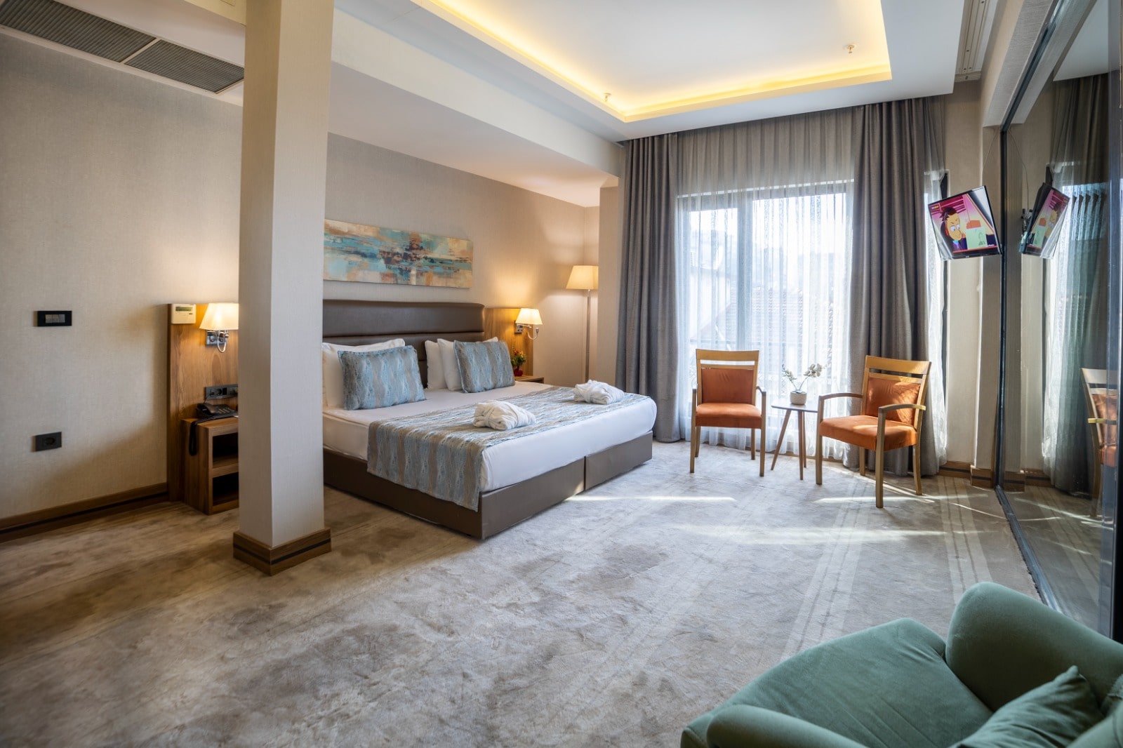 Everything you may need in our standard rooms has been thought for our guests. Internet access is offered free of charge. Our standard rooms, where you will be comfortable during your business and holiday travels, have a usage area of 25-30 m2. Our rooms have two separate beds (twin bed) or a large single bed (french bed). You can relieve the tiredness of the day in our large marble bathrooms and start the new day with a comfortable sleep in our comfortable beds.
